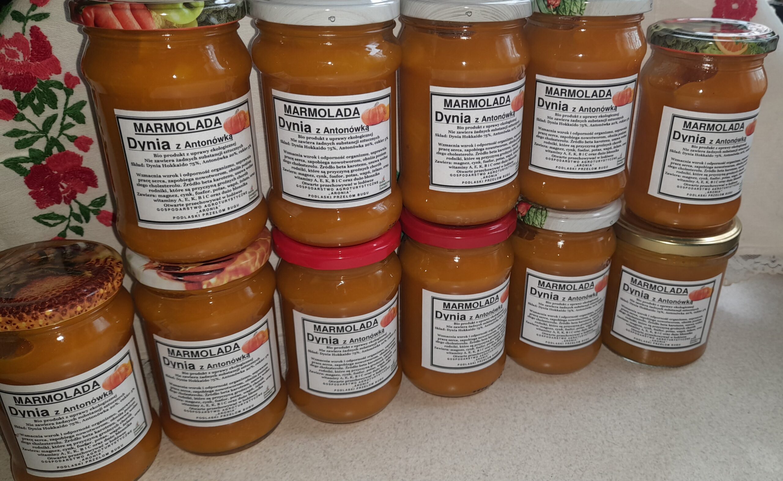 Dynia Hokaido 75% – Jabłko Antonówka 20%, cukier 5-10%, krótko pasteryzowane Pojemność: 0.35l – 15 zł 0,70l – 25 zł 0,90l – 30 zł