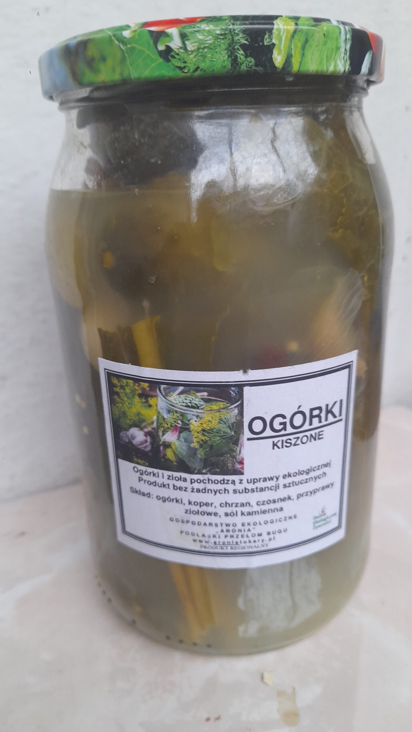 Ogórki kiszone, przyprawy i zioła: sól kamienna, chrzan liść i korzeń, koper, czosnek, ziele angielskie, liść laurowy, gorczyca
