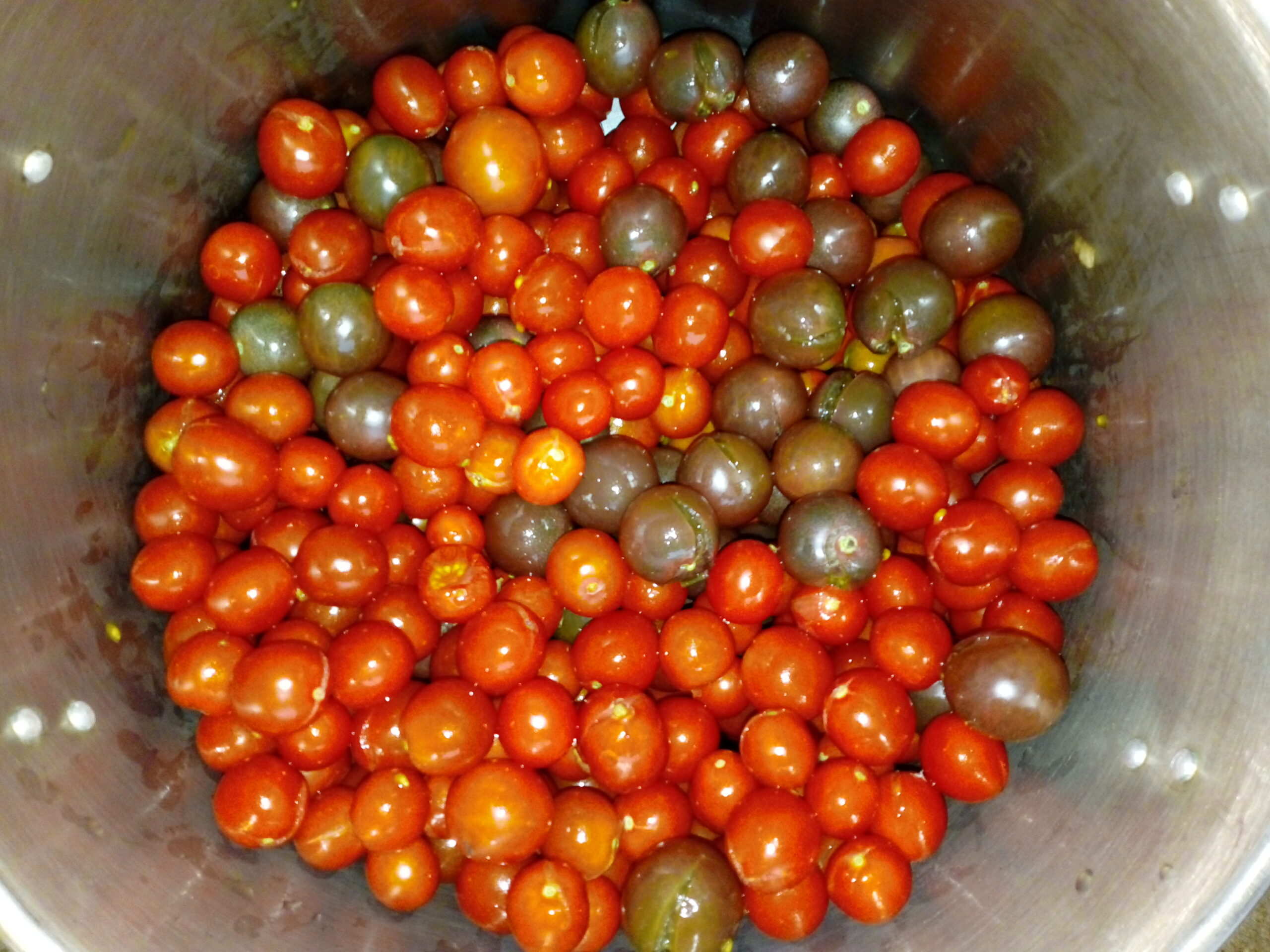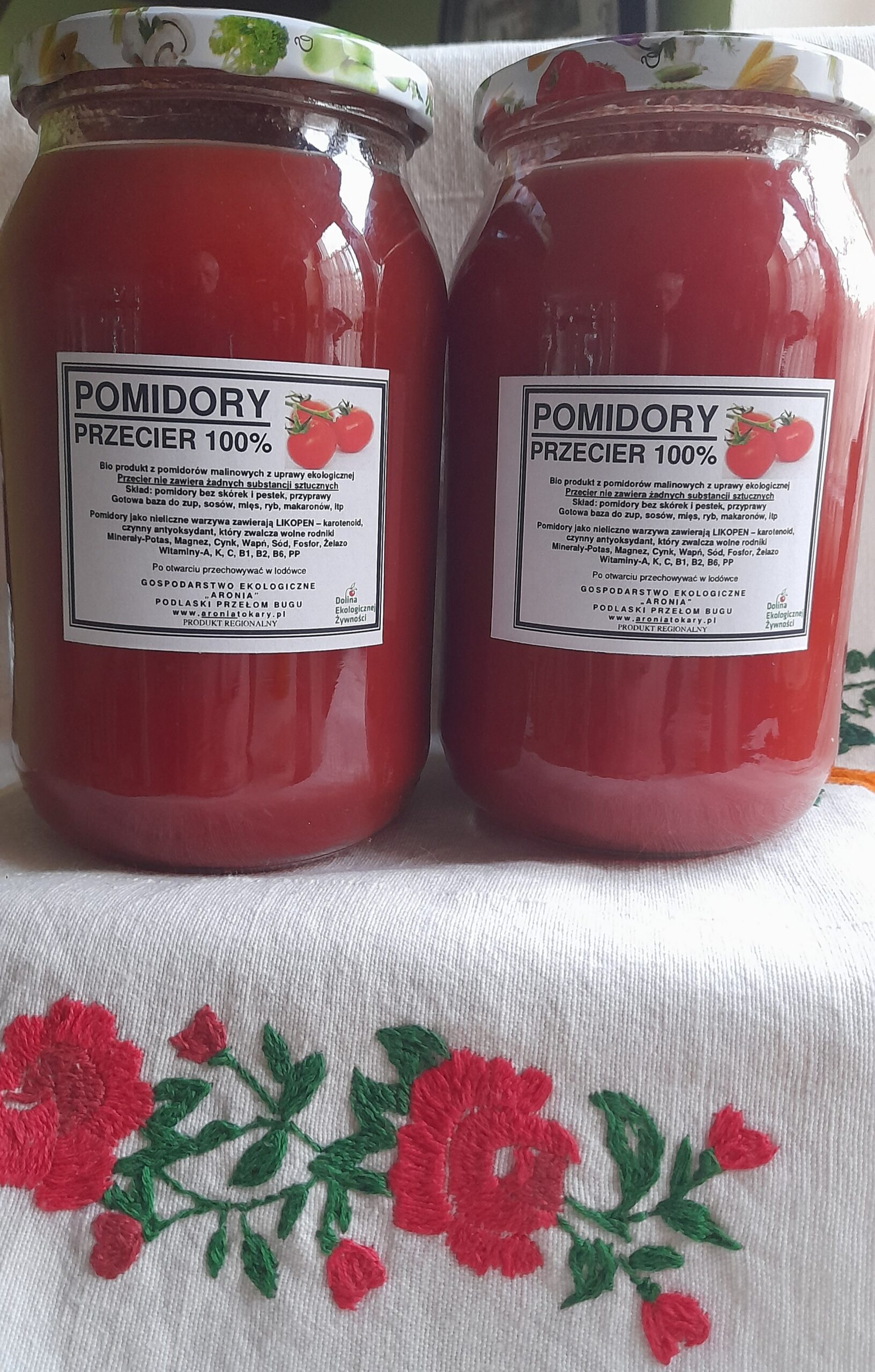 Przecier pomidorowy bez skórek, bez żadnych przypraw i dodatków z pomidorow malinowych dużych i cherry, różnych kolorów, dojrzałych w słońcu, zbiór sierpniowy i wrześniowy, pasteryzowany