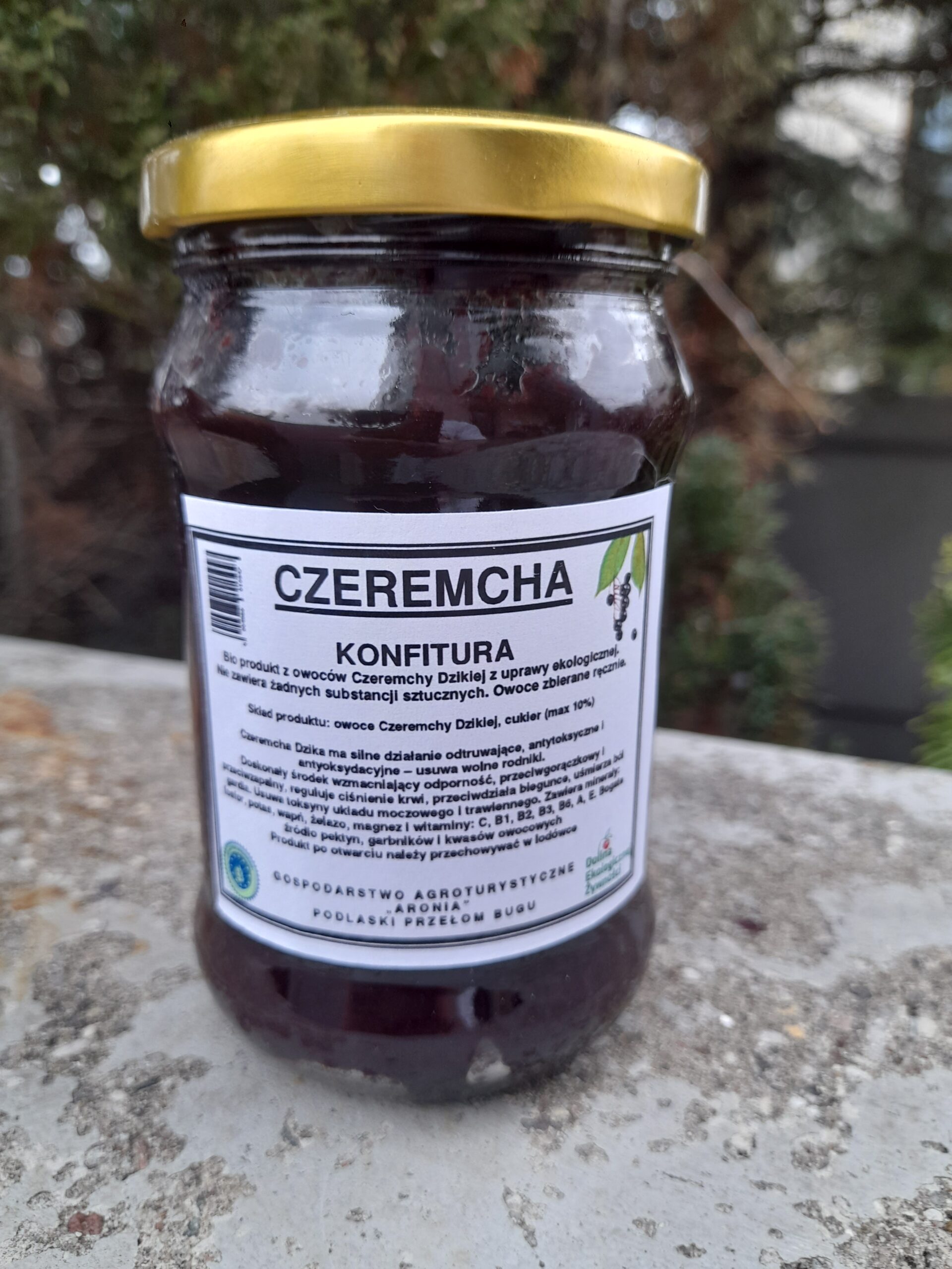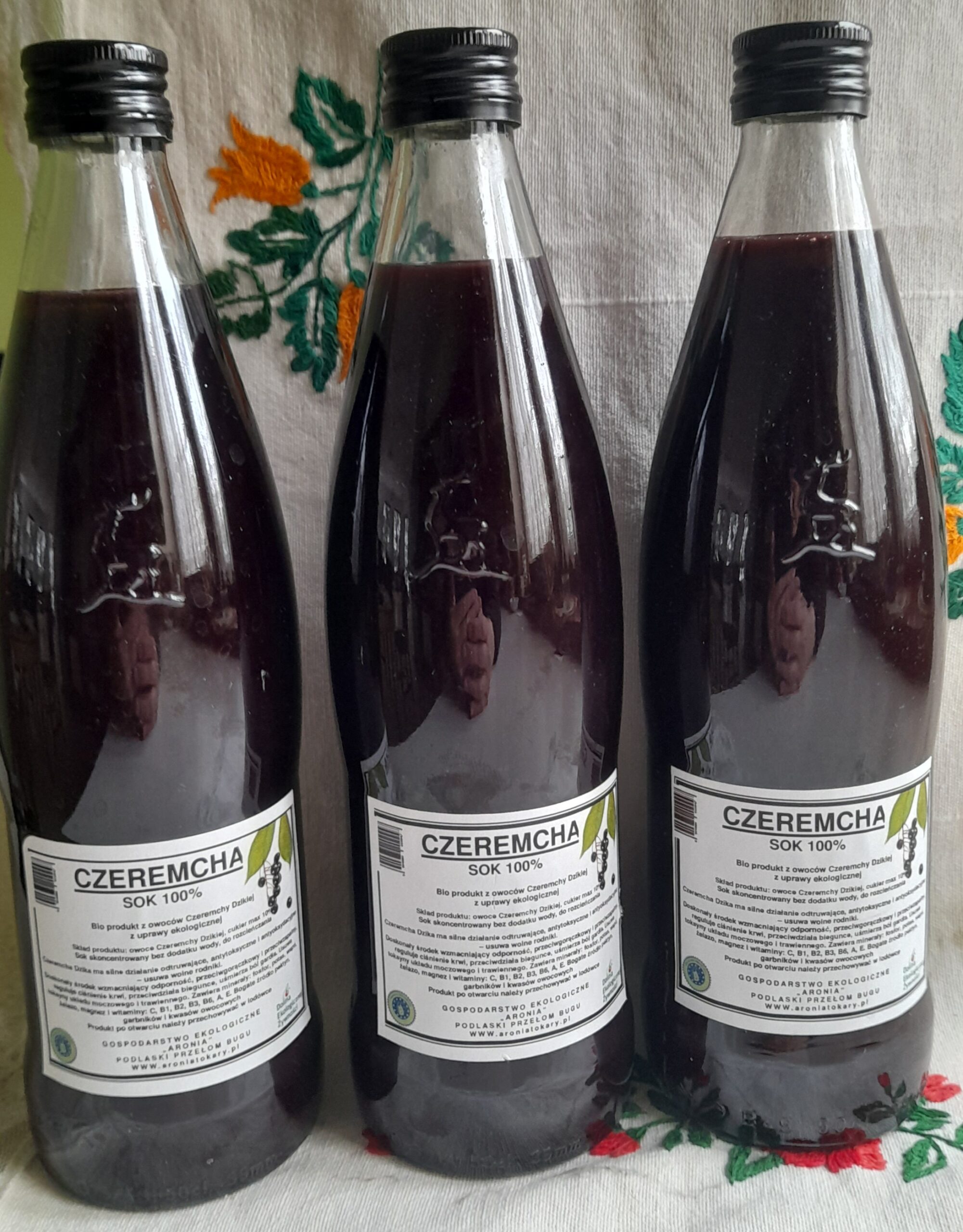 Sok z owoców czeremchy dzikiej z eko uprawy, 100%, bez dodatku wody, do rozcieńczania, cukier max 10%, pasteryzowany