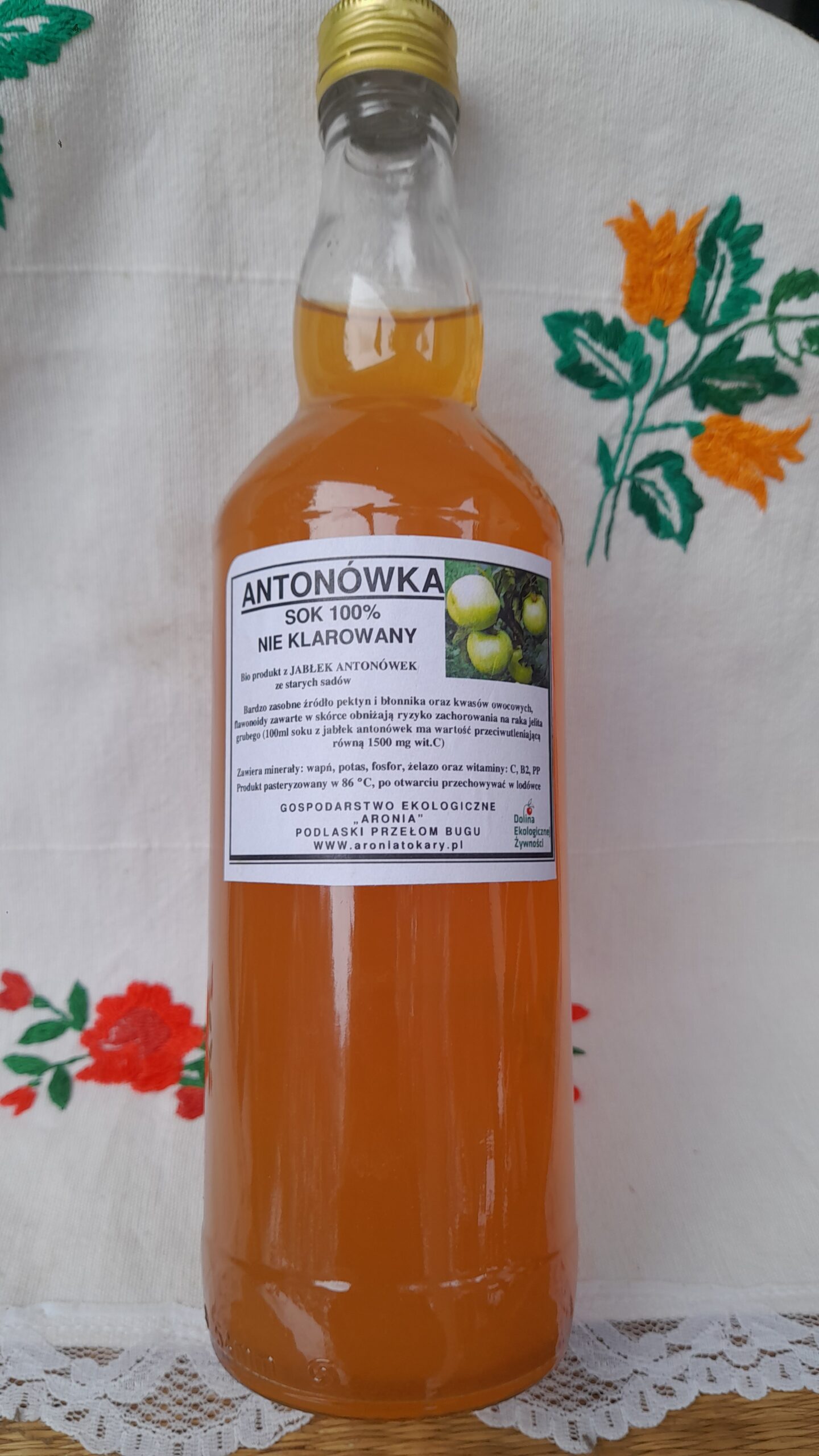 Sok z jabłek antonówek 100% bez dodatku wody, do rozcieńczania, cukier max.10%, pasteryzowany. Jabłka ze starych jabłonek, bez oprysku chemicznego